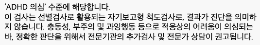 아래 사진처럼 검사 결과가 나옵니다. '정상' / 'ADHD 의심' 두 가지로 나오고, 확실히 하기 위해서는 전문가의 추가 검사가 필요하다는 문구가 나옵니다.